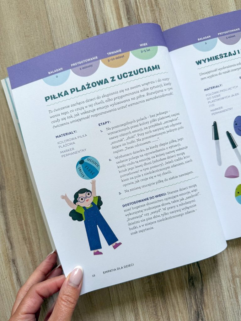 Przed Wami książka, która ujęła mnie w tak wielu aspektach, że muszę przyznać jej tytuł „perełki”! Od świetnej konstrukcji, przez niezwykle przystępny rozdział z poradami dla dorosłych, aż po całe mnóstwo starannie uporządkowanych zabaw, które pomagają dzieciom zrozumieć emocje oraz uczą empatii i życzliwości! I piszę „mnóstwo”, zamiast 30, jak głosi okładka, dlatego, że każda zabawa ma pomysły na jej zmodyfikowanie przez dostosowanie do wieku lub doprawienie szczyptą kreatywności.