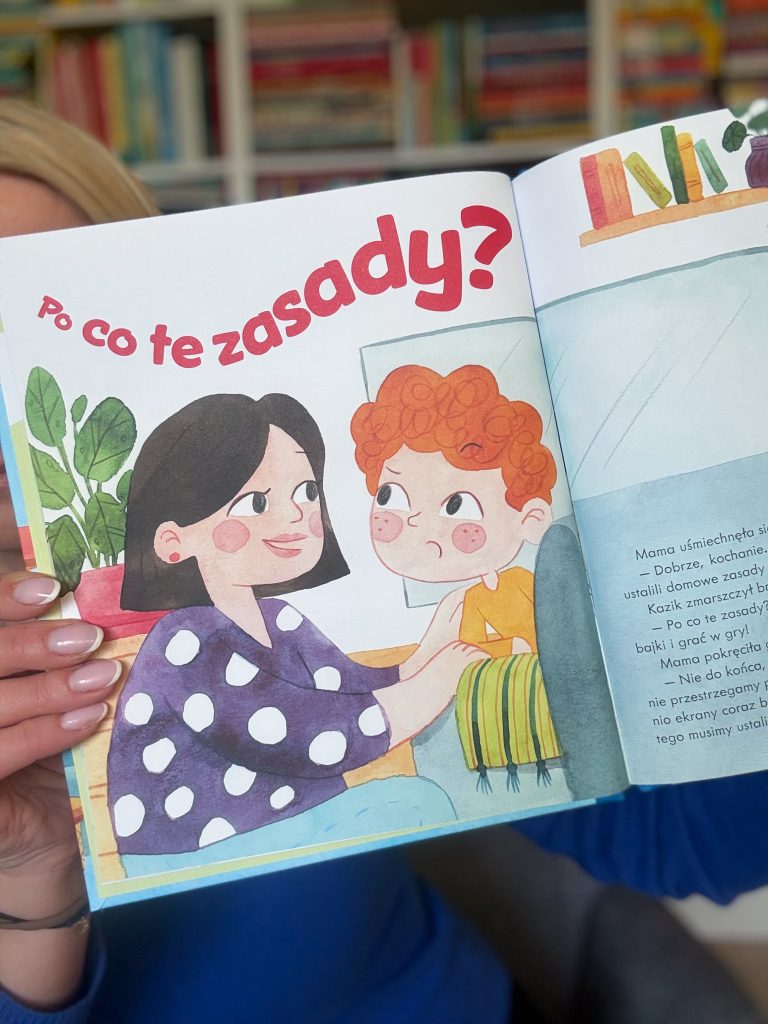 Ta książka jest jak gotowa ściąga! Znajdziecie w niej nie tylko świetny pomysł na domowy regulamin oraz czułe, mądre i trafiające do dzieci argumenty, jakimi posługują się rodzice Kazika. Na końcu książki – jak we wszystkim innych częściach serii – mamy też komentarz psycholożki ze wspierającymi KONKRETAMI, dotyczącymi m.in. limitów czasowych, sposobów ich mierzenia, wyboru treści, czy odpowiedzi na gwarantowane pytanie: „dlaczego?!”.
