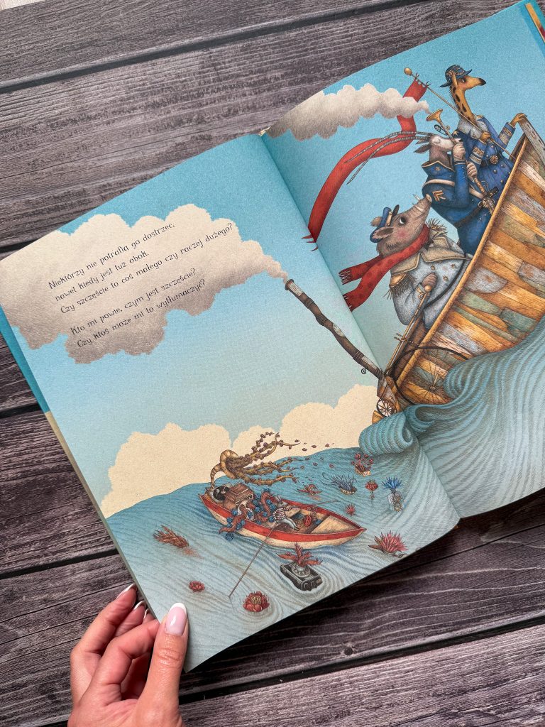 „Co to właściwie jest szczęście?”, pomyślała, zbierając na plaży wyrzucone przez fale skarby. Zwykłe, niezwykłe przedmioty, m.in. duży czerwony guzik, czy adapter z wystającymi z tuby pędami. Zapakowała je na malutką łódeczkę i wypłynęła w morze, a to, co widziała w trakcie podróży, rodziło w jej głowie kolejne pytania. „Czy szczęście to coś małego czy raczej dużego?” zastanawiała się, mijając dużą łódź z wysokiej rangi wojskowymi. Czy we wszyskich językach szczęście znaczy to samo? – dumała, gdy mijali ją podróżnicy z egzotycznych krajów. „Są tacy, którzy go nie widzą, nawet kiedy mają je tuż pod nosem” myślała, a pod nią przepływała wtedy gigantyczna ryba. Tych rozważań w jej serduchu zrodziło się wiele… Zastanawiała się nad docenianiem szczęścia, wypatrywaniem go i uciekaniem przed nim. Nad tym, czy szczęście kryje się w tym, co nowe, czy raczej w tym, co stare i znajome. Czy bierze się z bliskości i czy można je kupić?
