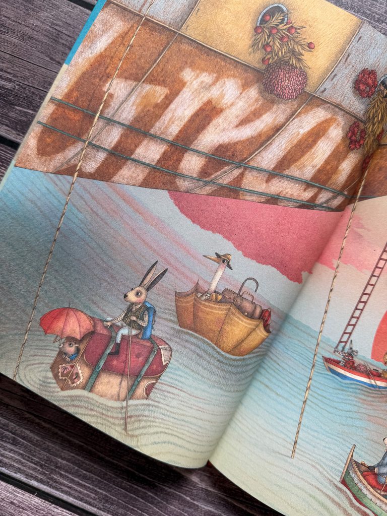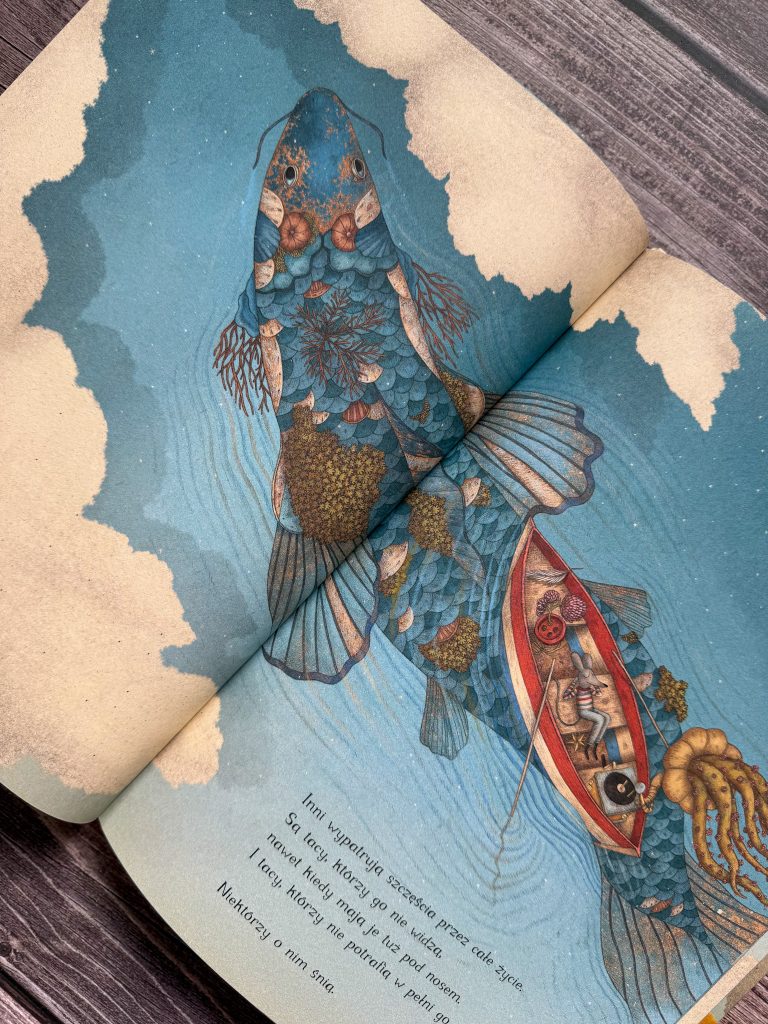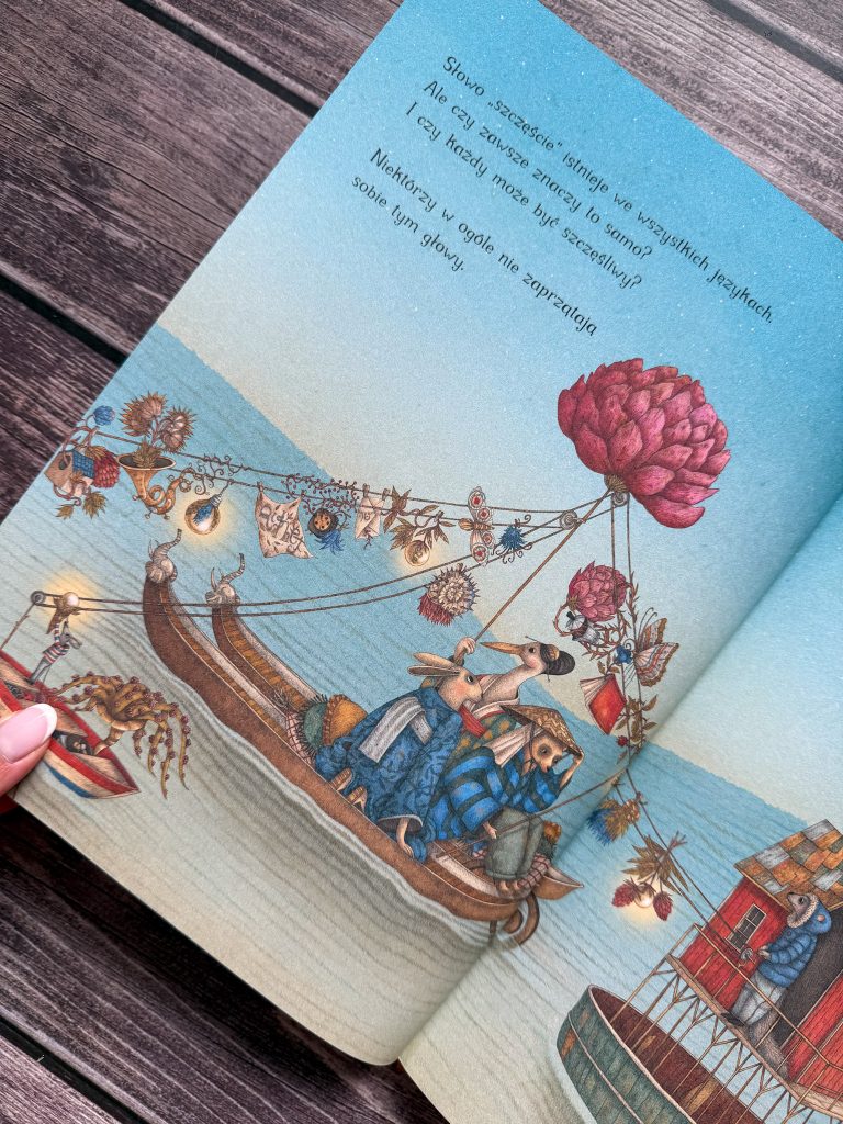 A między tymi wszystkimi myślami, wciąż ponawiała pytania „Kto mi powie, czym jest szczęście? Czy ktoś może mi to wytłumaczyć?”. Zdania, które zatrzymają małego czytelnika i skłonią do zastanowienia się nad własną definicją szczęścia. Jeśli nie za pierwszym razem, to za kolejnym lub jeszcze następnym. Bo to nie jest książka do czytania „na raz”, tylko do ciągłego odkrywania nowych warstw i szczegółów.