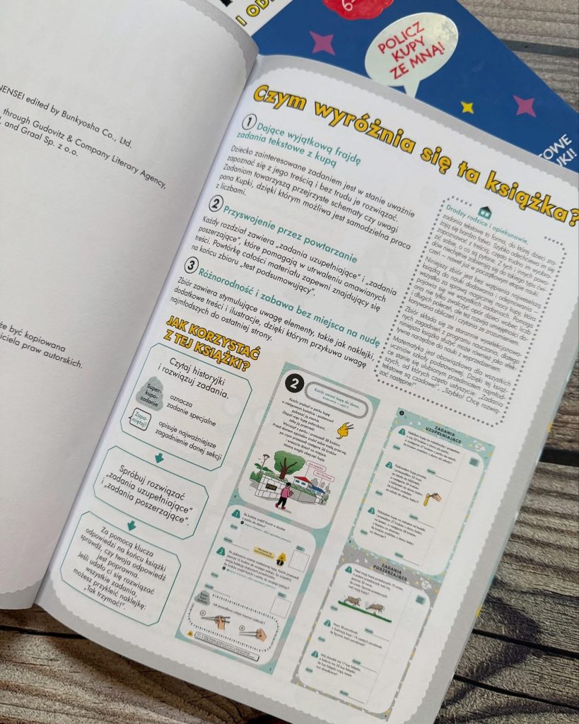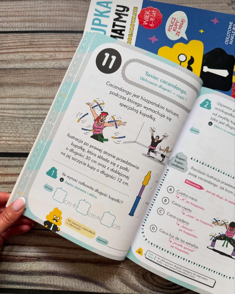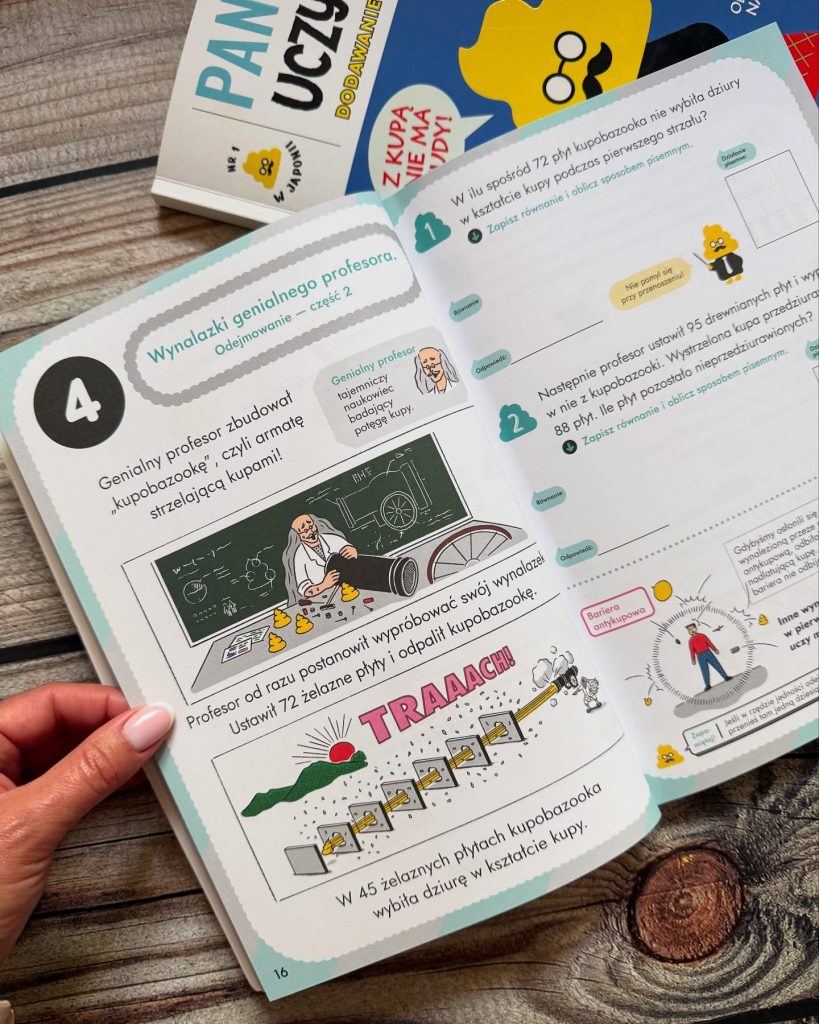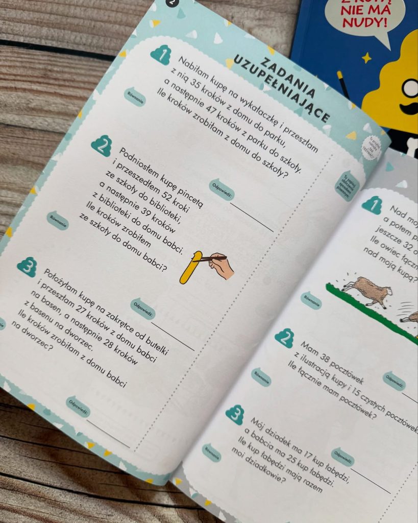 Takim i podobnym zadaniom z treścią Pana Kupki towarzyszą przejrzyste, a przede wszystkim wesołe schematy, rysunki i uwagi. Są tak fajne, że ciężko przestać się nimi bawić… wróć – uczyć. I nagle okazuje się, że maluch nie tyle powtarza i ćwiczy zagadnienia z podstawowego programu nauczania, ale zaczyna wybiegać z materiałem do przodu!