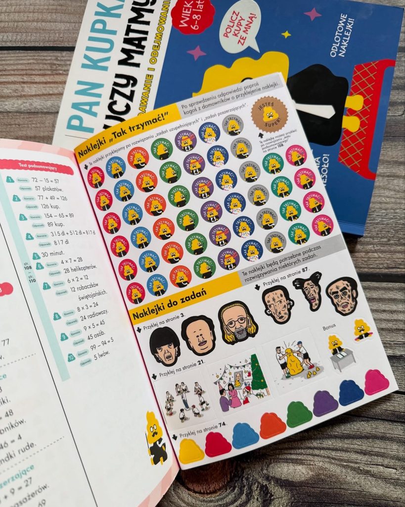 Ale jeśli myślicie, że „śmierdzący” temat to jedyna atrakcja tej książki, to spieszę poinformować Was jeszcze o naklejkach motywujących (oczywiście z kupą) i naklejkach potrzebnych do rozwiązania niektórych zadań.