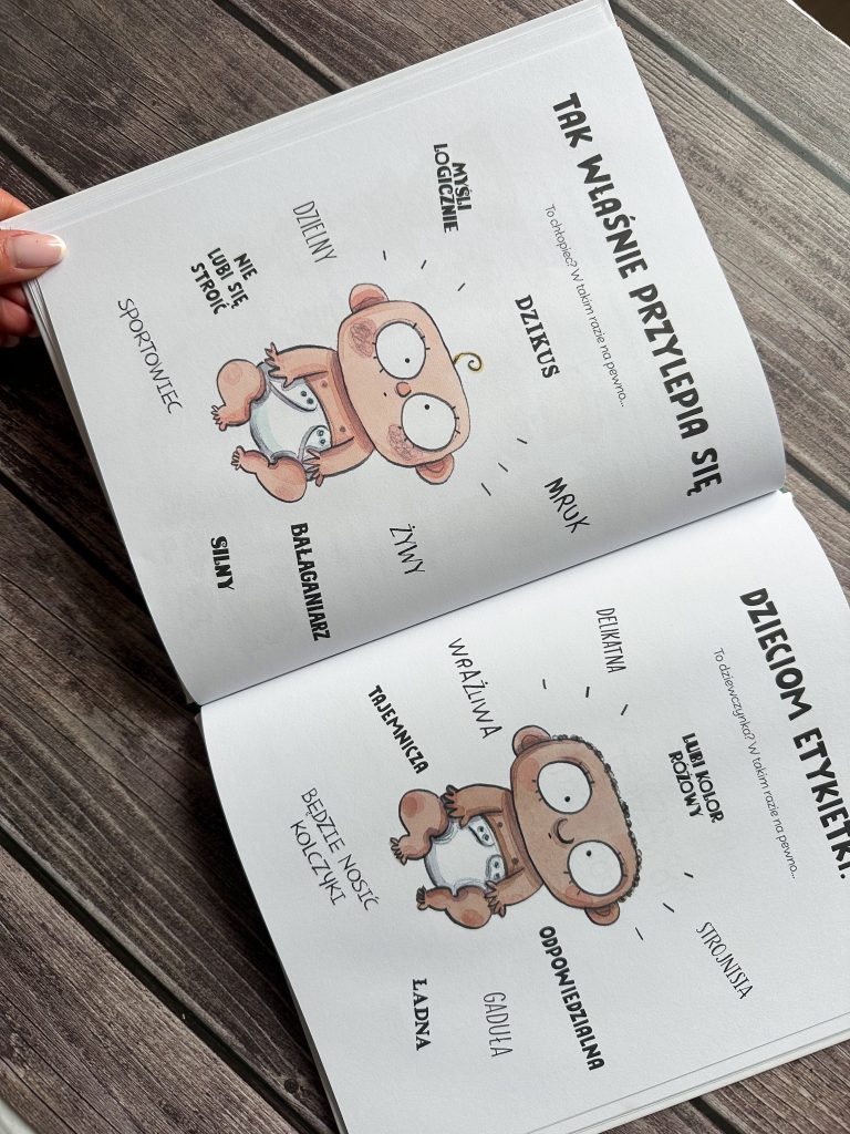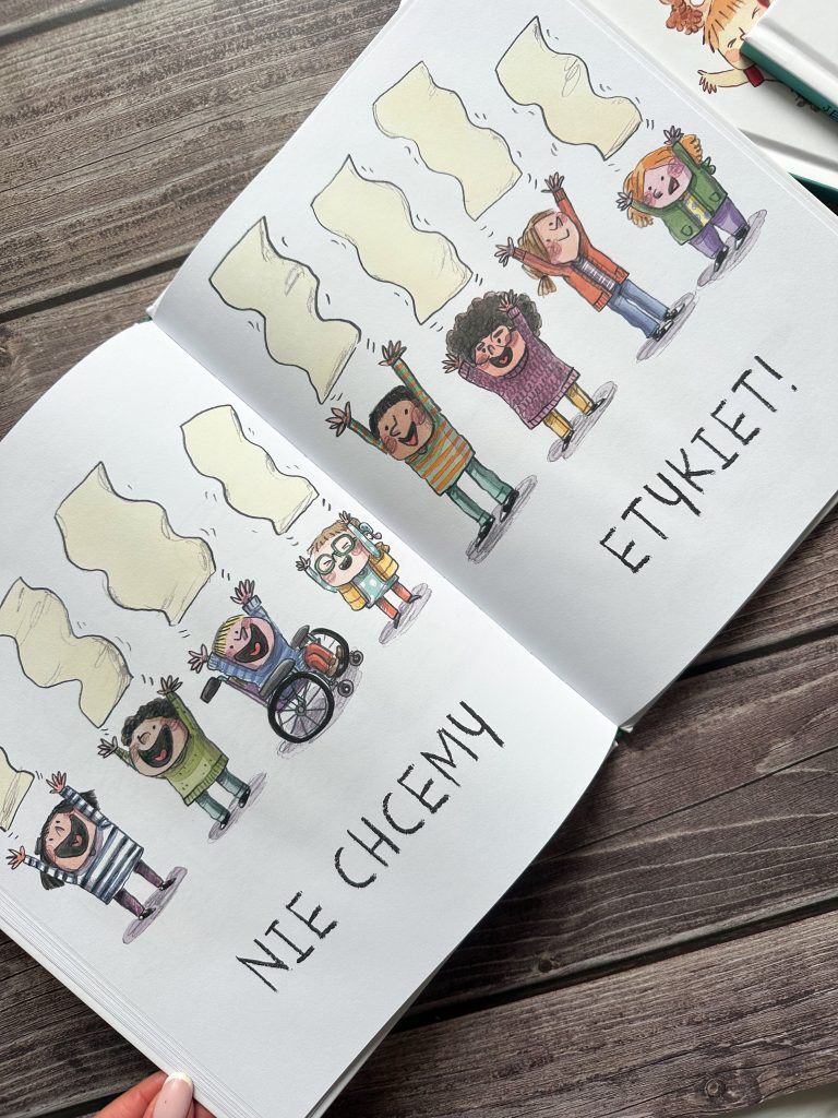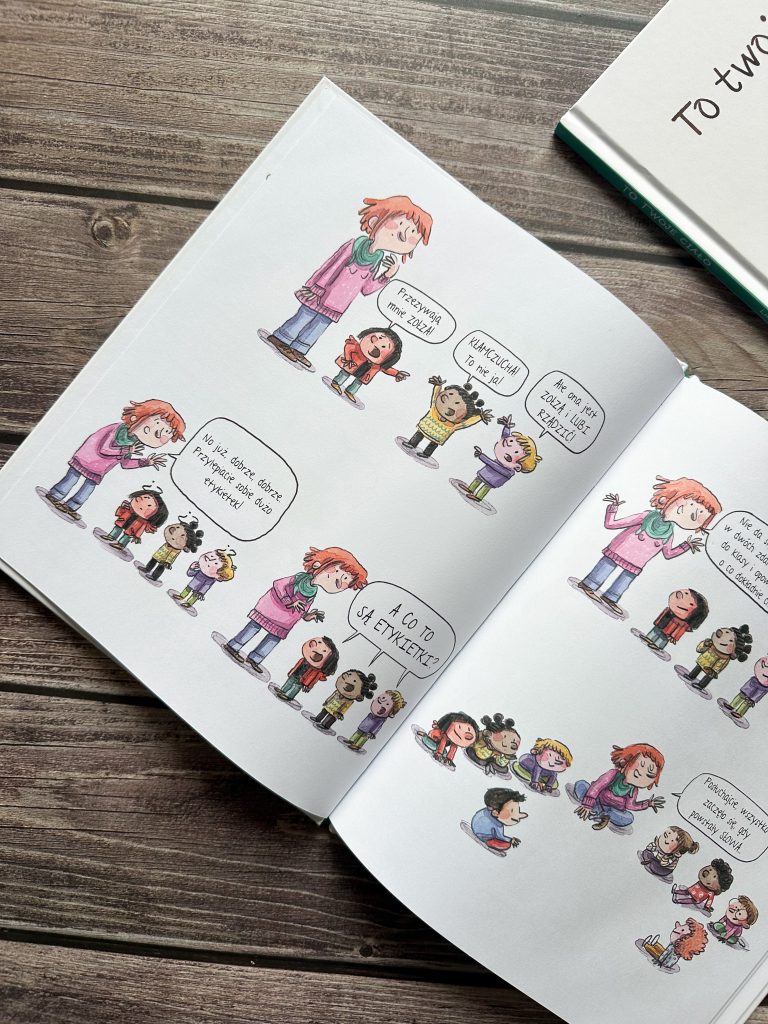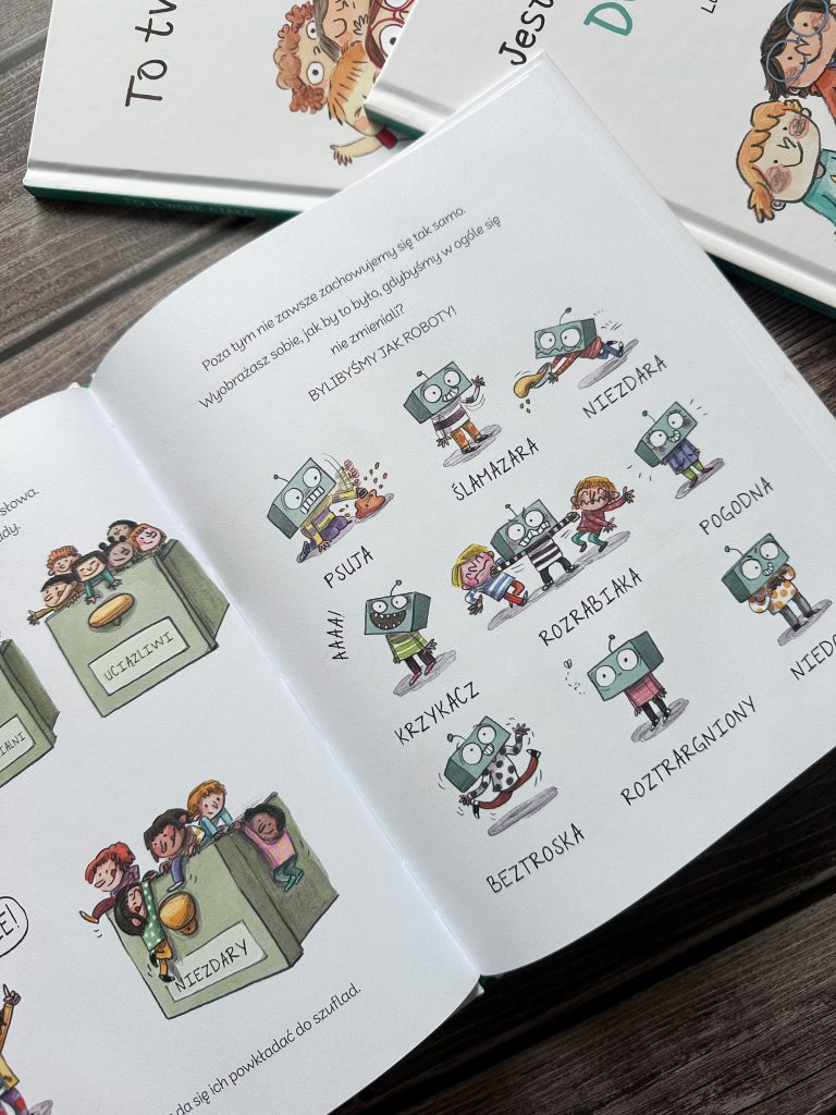 Tutaj symboliczna, mała karteczka, przyczepiona do czoła, rośnie coraz większa i większa, by przygnieść dziecko i w końcu całkowicie je zakryć. A dzieci określone mianem „Niezdary” siedzą w szufladzie. Myślę, że trafniej przedstawić się tego nie dało. Autorka opowiada też dzieciom o etykietach, związanych z płcią, akcentując, że to nie jest w porządku i żebyśmy pozwolili im być po prostu sobą. Uczy też, jak rozmawiać i wyrażać swoje opinie. Nie o osobie, a o jej zachowaniu. Absolutnie nie o wyglądzie. Jeśli popełnimy błąd – przeprośmy, bo przecież wciąż się uczymy, a więc możemy się mylić.