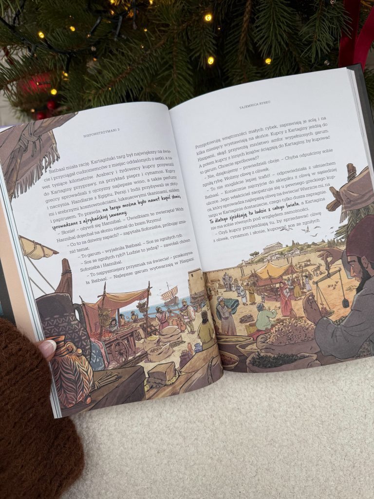 Biorąc za punkt wyjścia starożytną Kartaginę, największe i najbogatsze wówczas miasto na świecie, autor przeprowadza dzieci przez motywy, jakie kierowały ludźmi, którzy wyprawiali się w dalekie podróże i pokazuje wielkie targi, na których można było kupić właściwie wszystko. Opowiada czytelnikom o powstaniu pieniądza (najsprytniejszy wynalazek w dziejach). Uświadamia, że konflikty zbrojne, wprawdzie polegały na toczeniu bitew i zabijaniu, ale były też okazją do podpatrywania zwyczajów, osiągnięć, a nawet rozrywki wrogiej strony. Pokazuje też, w jaki sposób w poszczególnych regionach pojawiały się i znikały kolejne religie, w tym chrześcijanizm.