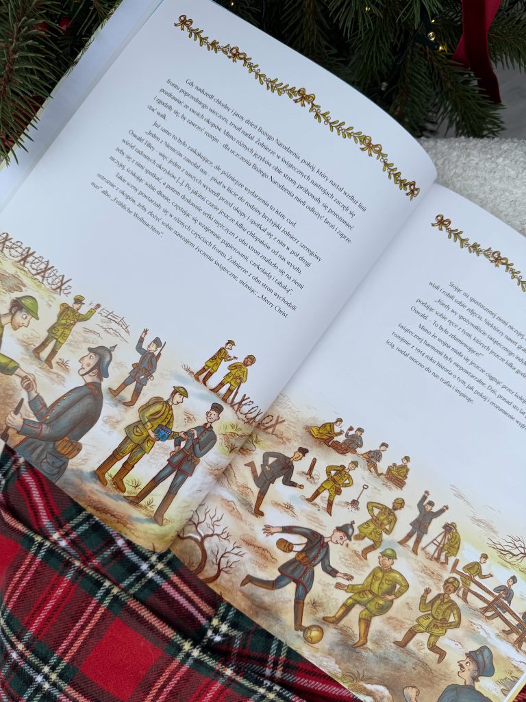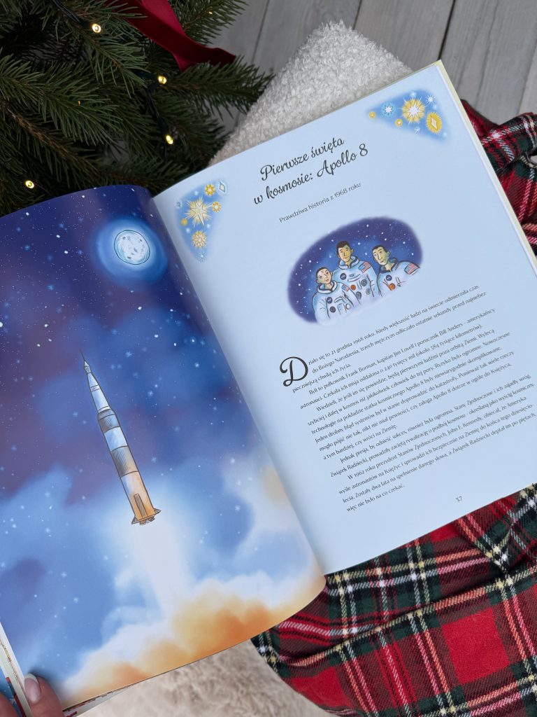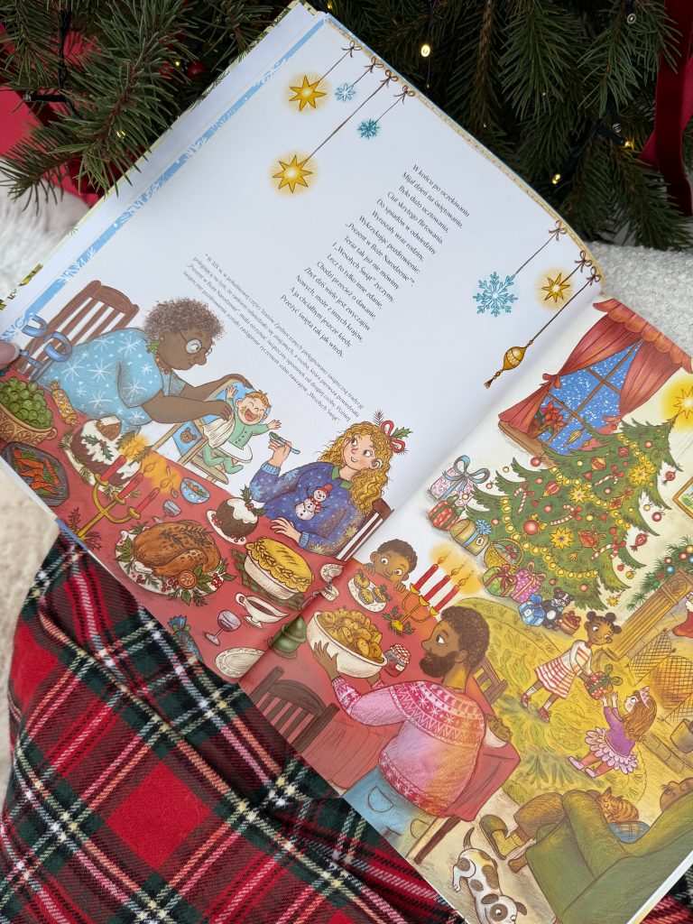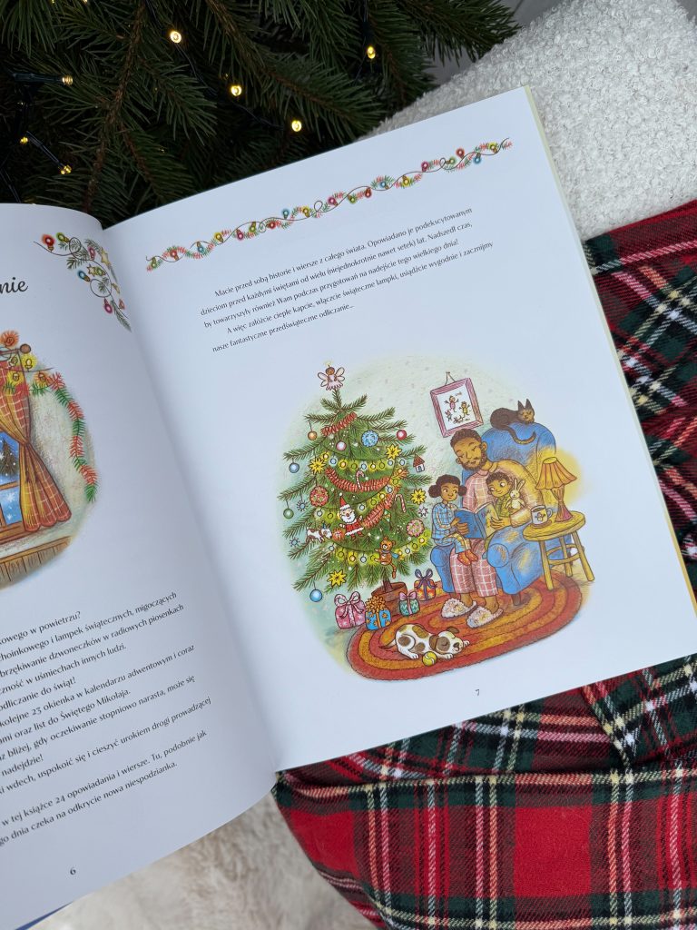 Wśród 24 historii znajdziecie zarówno klasyki, takie jak baśń o Królowej Śniegu, czy Dziadek do Orzechów, jak i mniej znane opowiadania, np. duńską bajkę o leśnej czarownicy, czy ukraińskie podanie ludowe o pająku i choince. Są świąteczne fragmenty moich ukochanych książek – „Aksamitnego Królika”, „O czym szumią wierzby” i „Opowieści wigilijnej”. Dzieci poznają prawdziwą historię z czasów pierwszej wojny światowej, gdy w 1914 r. żołnierze dwóch przeciwnych stron wyszli z okopów i wspólnie świętowali Boże Narodzenie. Będzie też autentyczna historia brytyjskich badaczy, którzy w 1902 r. spędzili święta na Antarktydzie oraz opowieść o pierwszych świętach w kosmosie! A na deser – wiersze i piosenki!