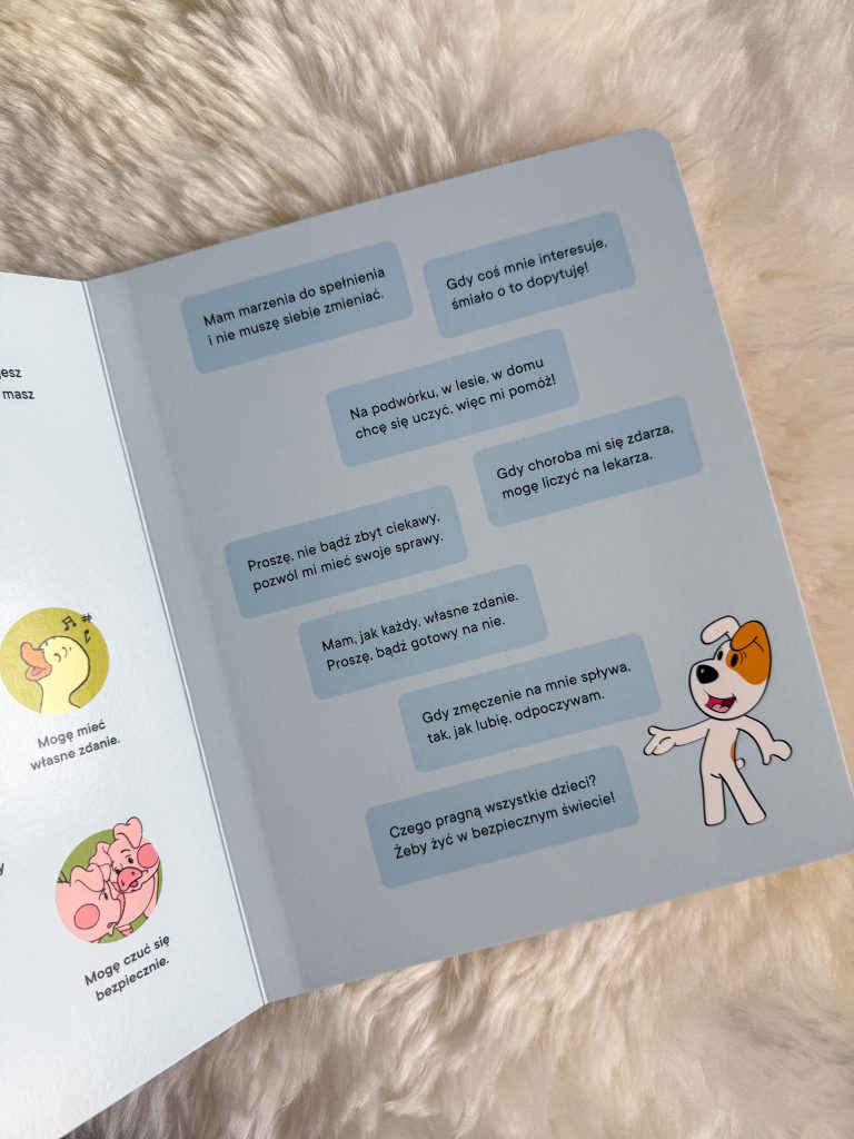 Te, jakże ważne, uniwersalne przesłania zostały zebrane i podsumowane na ostatniej rozkładówce, gdzie maluchy znajdą wpadające w ucho i pamięć rymowanki. Mnie szczególnie ujęła ta: „Mam marzenia do spełnienia i nie muszę siebie zmieniać”!