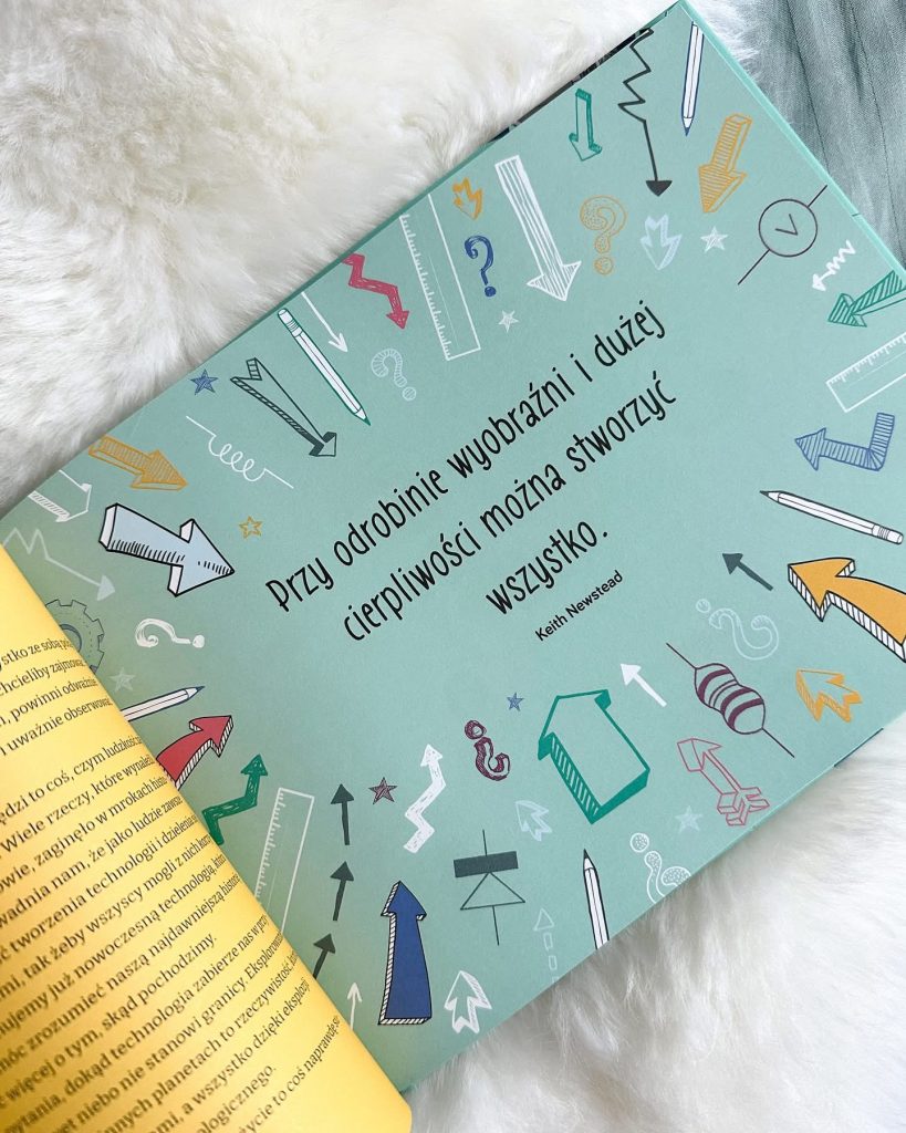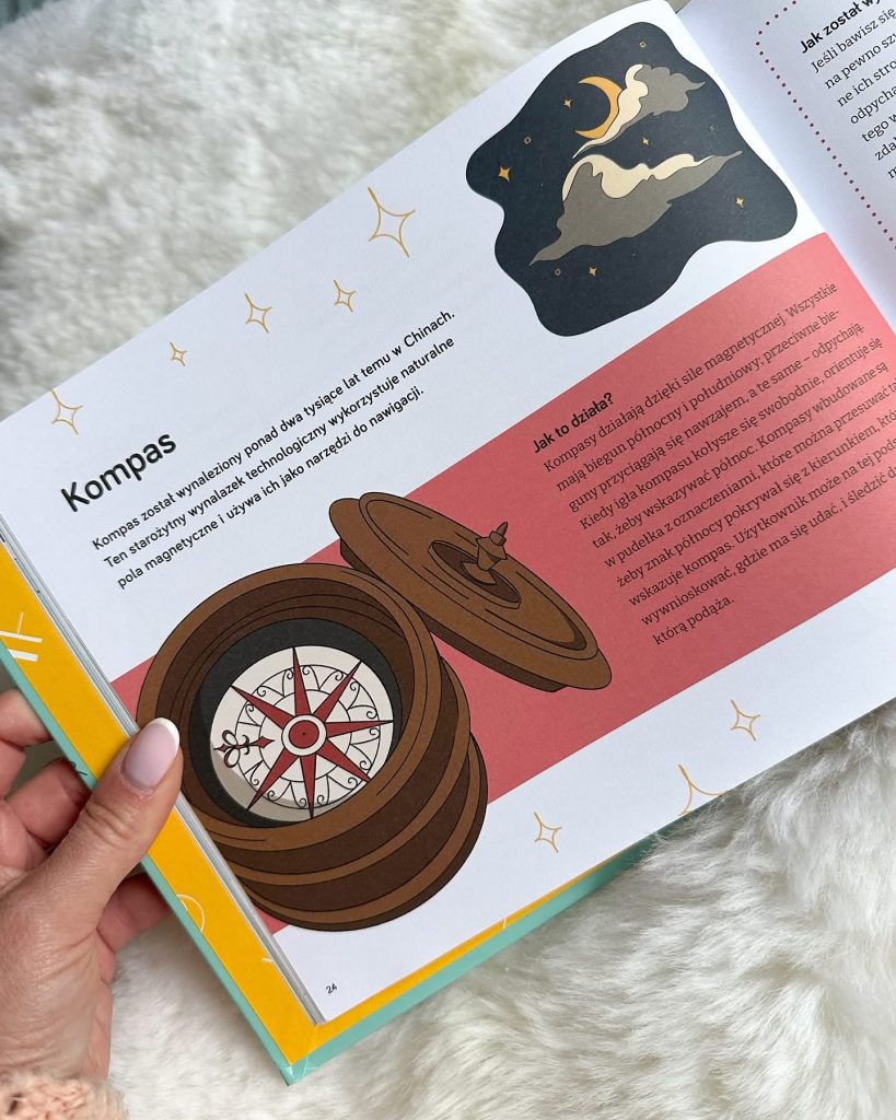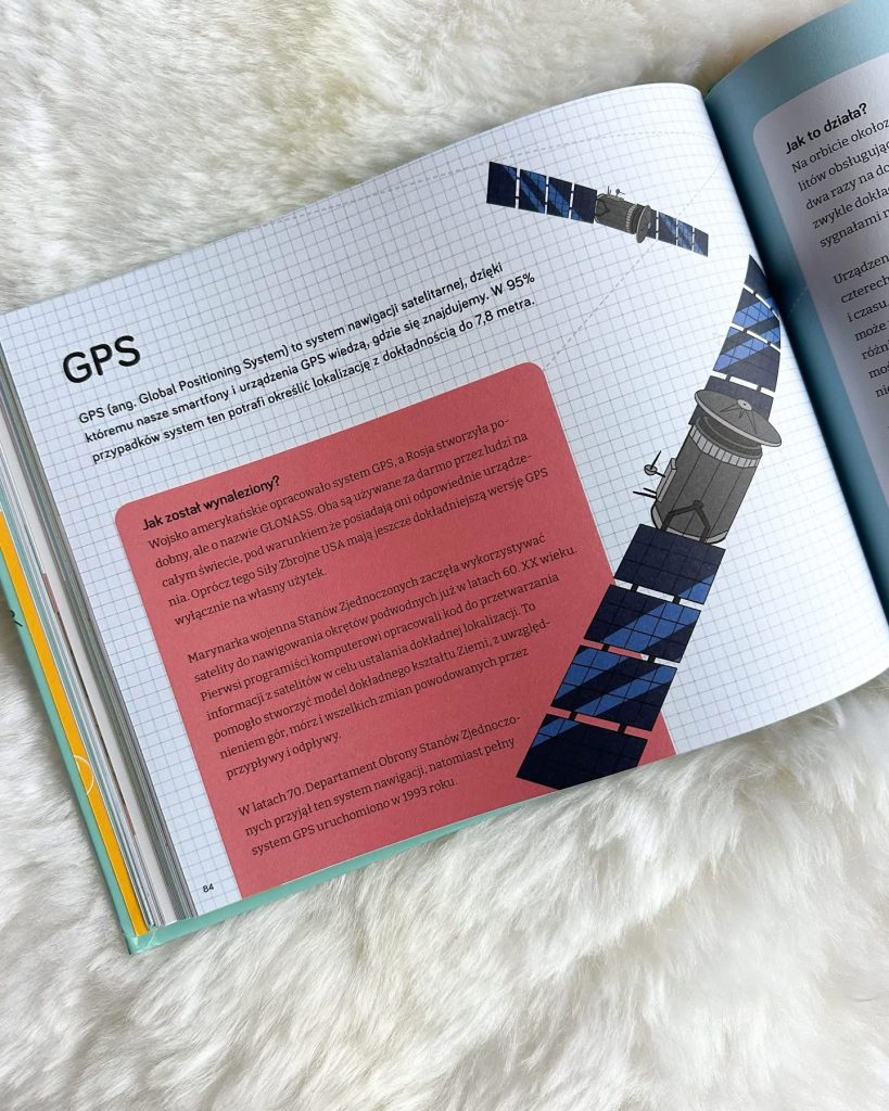 Na kolejnych rozkładówkach odkryjecie m.in., jak działa mechanizm zegara, w jaki sposób powstawały pierwsze książki i jak zmieniła nasz świat rewolucja przemysłowa. Przeczytacie o fotografii, telewizji, światłowodach i ultradźwiękach. Dowiecie się, czym jest kod binarny, elektronika, czy wspomniany na wstępie GPS. A to tylko przykłady, bo w książce jest tego dużo, dużo więcej.