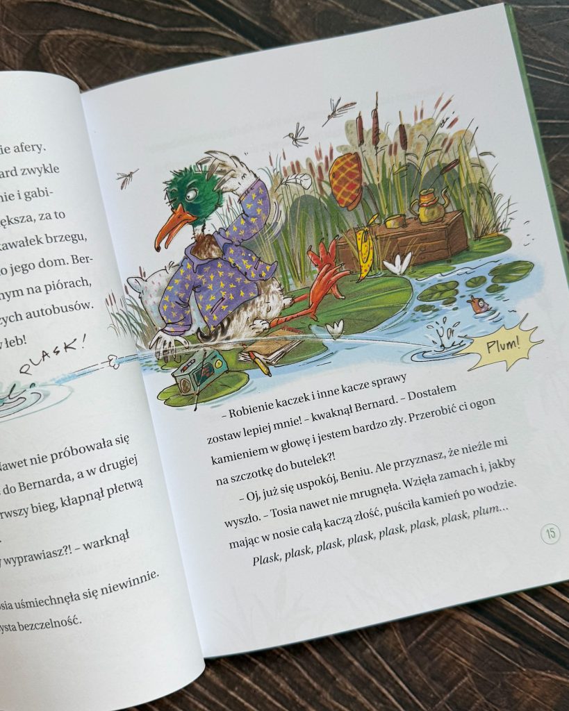 Przed Wami pierwsza część przygód Bernarda – kaczora, który na detektywistycznej robicie zna się, jak mało kto. Ten bystry ptak przez lata służył w Ptasim Patrolu i chociaż swoje już w życiu wylatał, to w dalszym ciągu nie jest się w stanie oprzeć dobrej, kryminalnej zagadce. Zwłaszcza, jeśli w detektywistycznej robocie pomocą służy mu sprytna i dociekliwa wiewiórka Tosia.