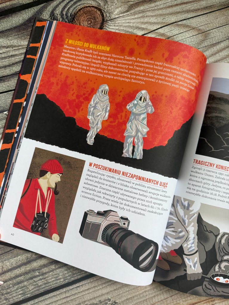 Dzięki tej pasjonującej książce odkryjecie, co wspólnego z wulkanami ma piękna biżuteria z ametystem i dlaczego plaże Wysp Kanaryjskich mają czarny piasek. Poznacie pracę wulkanologów, ich strój i najważniejszy ekwipunek, a także sylwetki najsłynniejszych badaczy wulkanów. Znajdziecie tu różne wierzenia, mity i legendy związane z wulkanami i historie słynnych wybuchów (w tym zagładę Pompejów). Odkryjecie, jak wygląda życie ludzi, którzy mają domy w sąsiedztwie tych ognistych olbrzymów i w jaki sposób najbezpieczniej je zwiedzać. A na koniec – poznacie bliżej ciekawostki o czternastu różnych wulkanach, m.in. o Wezuwiuszu, Kilimandżaro, Yellowstone, Fudżi, Cotopaxi, czy Etnie.